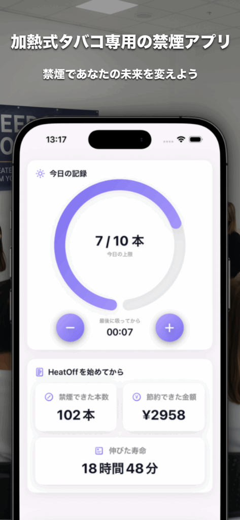 HeatOffは加熱式タバコ専用の禁煙アプリです。